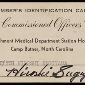 Hiroshi Sugiyama's membership card to the Non Commissioned Officers' Club, Detachment Medical Department Station Hospital, Camp Butner, North Carolina, USA, [1941/1945].