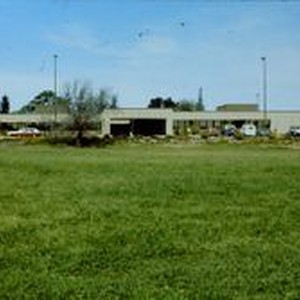 Print, color: In the distance Palm Drive Hospital and pasture in the foreground. In 1980 doctor's offices were built in the pasture area.