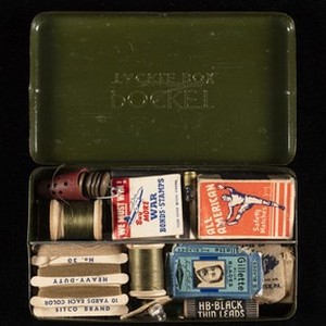 A sewing kit belonging to Hiroshi Sugiyama, [1941/1945]. Contains thimble, spare buttons, matchbook, matchbox, sewing thread on wooden spools, metal object, needle holder, felt with needles, receipt, sewing thread on cardboard spools, safety pins, box of razor blades, roll of tissues, miniature lightbulbs, and pencil leads.
