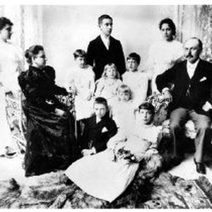 Group portrait of eleven family members. What are probably husband and wife are seated and the children are posed surrounding the parents. Group is unidentified.