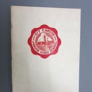 Yearbook, Kit Carson Junior High School. "Hilites", June 1954. The cover is of white light weight card stock with the school emblem and title printed in red.