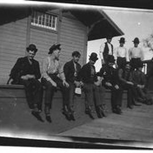 Photo--black and white: Railroad workers on train station platform in Forestville.