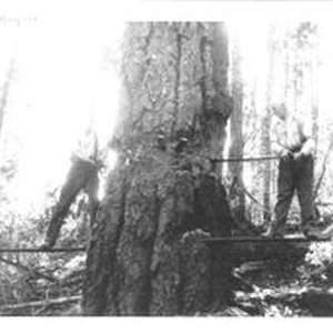 Ralph S. Stugeon and his father Wade Sturgeon falling a tree on Ed Smith's timber, Coleman Valley up along Coleman north side boundary, or Ed's south line, September 5, 1945