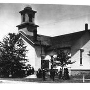 Photo--sepia: Baptist Church of Sebastopol 1911-1920. Wooden clapboard one story building with bell tower and stone foundation. Men and women standing in front of church about 1910s. This church was located on the corner of Huntley and Neva Street in Sebastopol.