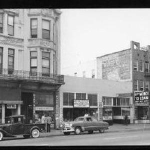 Panorama of the east end of J St. between 5th and 6th (south side of street). Businesses (Liberty Club, Levey's Bargain Store, Rick's Money to Loan, Golden Gate Hotel, Taft Hotel, Wilbur Hotel), cars and pedestrians.