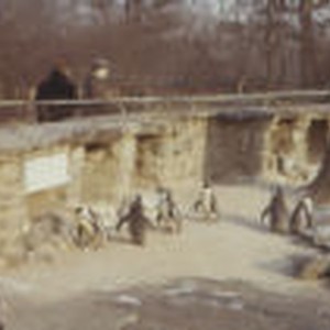 Six penguins standing idly in their confined exhibit area at the Bronx Zoo.