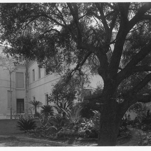 View of trees and plants in front of the North façade of the residence. North entrance is just out of frame on the left. Handwritten note above the photo in album says "Palms, cycads and other ornamentals - north court - HEH Residence." For another copy, see photCL 107 vol8 (14).