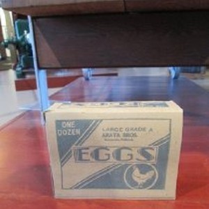 Egg carton. Cardboard, with blue graphics and lettering. "Arata Bros. Sacramento, Calfiornia".