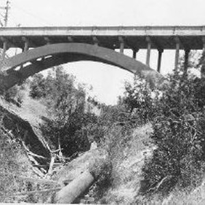 View looking up at bridge from canyon below. Construction materials scattered in canyon. Probably the mini Rainbow Bridge.