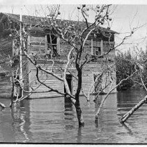 Pear crop remains in trees in orchard covered with flood waters near Isleton.