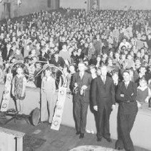 Charity event for kids based on a Robin Hood theme. Everyone wears Robin Hood-style paper hats. Organizers at front of auditorium with various toys to be given away.