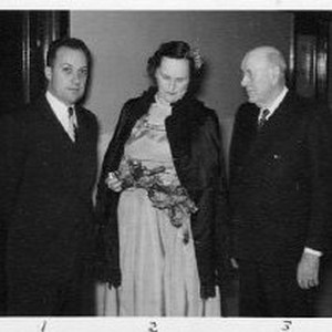 View of from inside Sacramento's City Hall, on the left Phil Wilkins, Genevieve Didion, and Percy G. West just before cutting the centennial birthday cake. Mrs. Didion is holding the ceremonial knife.