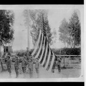 Photo -black and white: Barlow's Berry Camp flag raising ceremony with five boy buglers. An adult and young boy are raising the flag. Young boys from the Children's Aid Society in San Francisco came to Sebastopol in the summers, lived in tent camps and earned money picking berries. Laura Miller Barlow ran the camps.