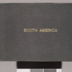 Bound in textured black material. The title "South America" is embossed in the center of cover in gold lettering. The number "68" is affixed to the top of spine with glue. Images are primarily postcards and souvenir photographs from Ecuador where the London's stopped for month on the voyage home from Australia. Includes photos of a train wreck on the Guayaquil and Quito Railway and bullfights at the Plaza de Toros. Light wear on surface and around edges. Some creasing of surface material at spine.