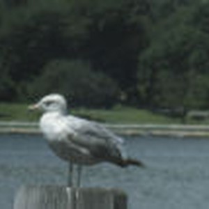 A herring gull standing on a post at the Mystic seaport.