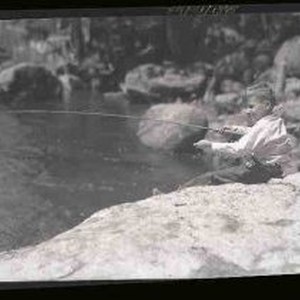 An unidentified young boy sitting on the bank of an undientified mountain stream holding a fishing pole. Handwritten date on edge of image "7 17 32".