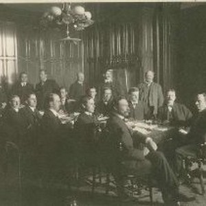 "Ways and Means Committe - 36th Legislature of the State of California, February 23rd, 1905. Compliments of the Chairman (P.H. Stanton)." View is of the committee members seated around a table in a wood paneled room with a chandelier above. Chairman Perrin H. Stanton is seated in foreground at head of table.