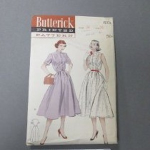 Women's dress pattern (a) and envelope (b), paper, multicolor, 21.3 cm x 13.5 cm. (b) envelope: Front "Butterick...6108, Bust 34, Size 16, 50 cents", handwritten in pencil "1950's", stamp "Jan 28", sketches of two versions; Back has measurements and instrcutions.