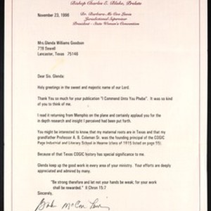 Barbara McGoo Lewis (Church of God in Christ), Los Angeles, California, letter, 1996 November 23, to Glenda Williams Goodson, Lancaster, Texas. [Description English/roman)]