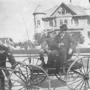 Harris Weinstock (co-founder of Weinstock Lubin?) (right) prepares to step down from a horse-drawn wagon. Large Victorian house across the street behind him. This is a photo of a photo tacked to a corkboard. High resolution scan available.