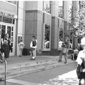 Library patrons wait on front steps for library to open.