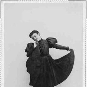 Young woman in knee-length dark dress and tights, flairs her skirt for picture.