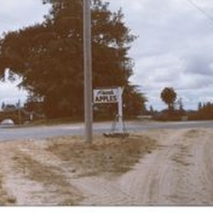 Photo--color: The Hallberg Apple Farm roadside stand sign along Gravenstein Highway North (Highway 116) 1979.
