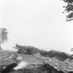 View of a dirt road under constrcution. Truck with road equipment parke to side.
