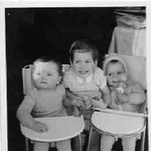 Three children, two are babies in highchairs (l. to r.): "Peter (my sisters's boy), Monika, and Martin."