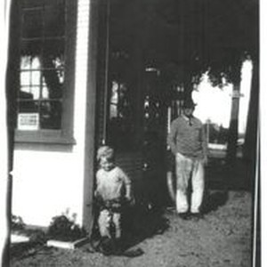Photo--black and white: Dr. Lynch in background and child Wallace Walton on tricycle in late 1920s or early 1930s by Walton Service Station in Sebastopol. Walton Service Station was located on Gravenstein Highway South in Sebastopol.