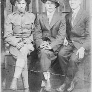 Photo--black and white: Karl Asman, right and two unidentified friends, one in US military uniform, about 1915. Possibly taken during Karl's military service in World War I. Karl Asman was married to Alice Riddell, granddaughter of Otis Allen.