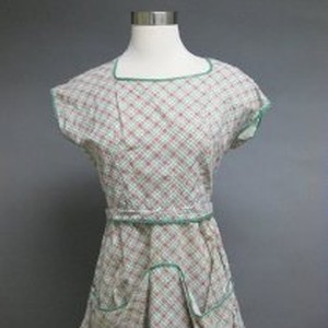 A pinafore style apron made of green, brown and white checked cotton. Large pockets in the front; back closure by a button at the neckline and ties.