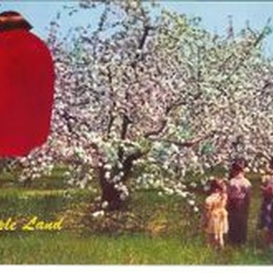 Postcard--photo--color: Apple tree orchard in bloom with three children looking on and inset of large red apple. Caption: "Apple Land" about 1950.