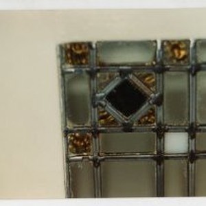 Interior view of the Merrium Apartments before demolition showing a leaded glass window pane.