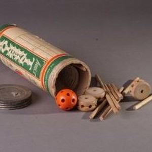 "Junior Tinkertoy for Beginners" in original container. Toys are wooden spools with holes outside to connect with wood rods. Packaging says that the contents will "construct a thousand different marvelous moving figures." Product is made by The Toy Tinkers Inc., Evanston, Ill. U.S.A.