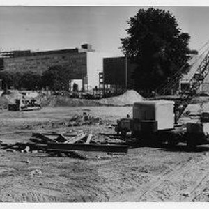 Exterior view of the construction company preparing the ground for the new Macy's Department Store between 4th and 5th Streets and K and L Streets. View is looking toward 5th and L Streets. Sacramento Savings and Loan in the center behind the tree had just completed construction.