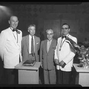 Four men standing behind two podiums; on one is a book and on the other is a sculpture of an eagle with scales. Original container marked "F.O.E. Eagles"