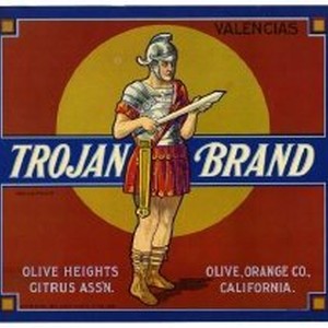 Crate labels. Trojan Brand Valencias, Olive Heights Citrus Ass'n., Olive, Orange Co., California. Great image of Trojan warrior examining sword.