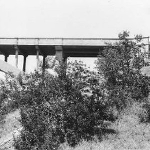 View looking up at bridge from canyon below. Construction materials scattered in canyon. Probably the mini Rainbow Bridge.
