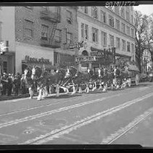 SERIES - Two views of the Budweiser Beer company eight-up hitch of Clydesdale draft horses pulling the Budweiser beer wagon. The wagon is moving down 11th street in front of the Affleck Pharmacy, Tan-Tan club, Golden Hotel, Mode-O-Day shop, California Apparel.
