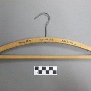 Wood pants hanger with metal hook, "Hageman's 25th & Jay St."