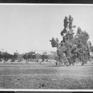 View of grassy pastures with the south façade of the residence in the background. The label that accompanies this photo in the album reads "No. 20 Pasture land south of the Henry E. Huntington residence, about 1911."