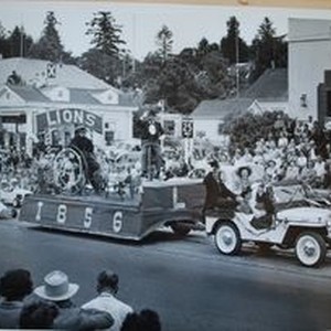 Photo--black and white: Sebastopol Lions Club scrapbook photo: Lions Club float at possibly the 1956 Apple Blossom Parade. The driver is Henry Martin and Edna Martin. The couple in the back seat are Edgar Herring and Billie Herring. In the background is the Sebastopol Post Office.