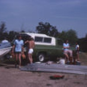 Mark Allen, Jeff Fudeu, Bill Sistare, Karen Slawson, Sue Troll, amd Diana Kowni looking at field vehicles at the Bernard Field Station lake lab.
