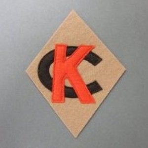 A felt diamond-shaped patch from Kit Carson Junior High School School of Sacramento with the intials: KC, tan background with red letter "K", and black letter "C"