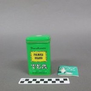 Can for Formosa Oolong tea, green with yellow trim and black lettering, and (b) booklet