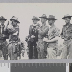 Five US Army soldiers and one civilian, holding a camera, stand looking away from the camera.