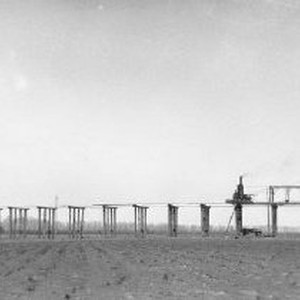 View of an unidentified bridge trestle under construction. Pile driver derrick at one end.
