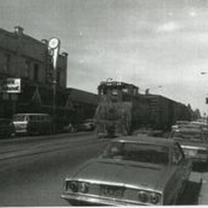 Photo--black and white: P&SR freight train traveling south on South Main Street, Sebastopol circa1970s.