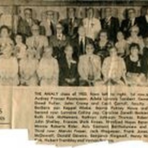 Photo--black and white: The Analy Union High School Class of 1933 45th reunion in 1978. 1st row L-R: Irma Savio Sunderman, Audrey Prosser Rasmussen, Adele Lummis Tambert, Genevieve Gunn Jolly, Dorothea Dowd Fuller, John Crump & Cecil Carroll (faculty), Dorothy Watson Dorward, Barbara van Keppel Wiebe, Bonita Putney Howe and Mary Sutherland Sexton. 2nd row L-R: Lorraine Collins Jay, Caroline Zanelli Barbiere, Anne Amaral Ingraham, Ruth Fisk McNamara, Kathryn Johnson Thomas, Robert Crowe, Glenn Dorward, John Shelley, Frances Shirk Kimes, Winifred Hayes Barend, Anna Reiter Lafranconi, Minnie Roberts Rider, Avis Siemsen Bartholomew and Dorethy Jones Showalter. 3rd row: Marvin Frazer, Jack Wegesser, Frank Jones, Leland Paschich, Charles McDowell, Donald Daveiro, Benjamin Kingwell, Henry Narron, Lloyd Dillaha, Ernest Kirk, Hubert Trembley and Vernon Bowers.